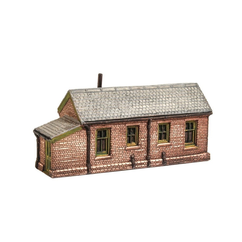 A useful red brick railway office designed to fit between rail tracks as its title suggests and beside the line especially in front of a retaining wall, as doors are at each end of the building (one is set into a vestibule). There are two toilets – the smaller windows with outlet down pipes on the rear wall are a bit of a give-away! A separate chimney is supplied for fitting into a hole in the grey slate roof. Size (mm) L 135; W 45; H 60