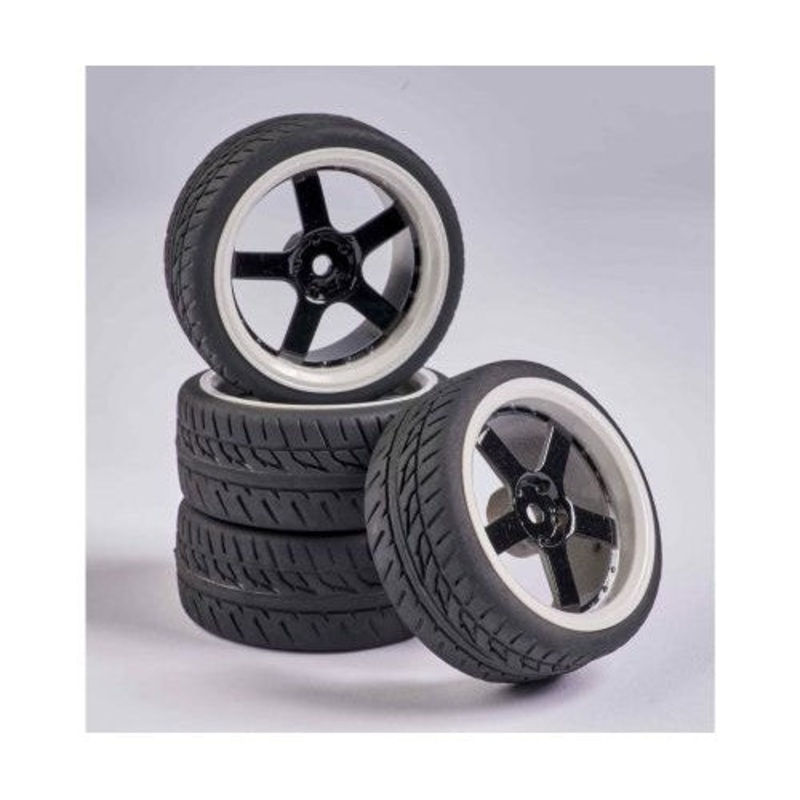 The fully bonded wheels are appropriate to on-road RC vehicles in a scale of 1:10 with 12 mm standard hex wheel hub. The special rubber compound of the tyres as well as the high-quality foam inserts and the handy road profile ensure excellent driving characteristics in almost all weather and road conditions. The fully black-and-white rims with five spokes also give your on-road RC vehicle a distinctive look!