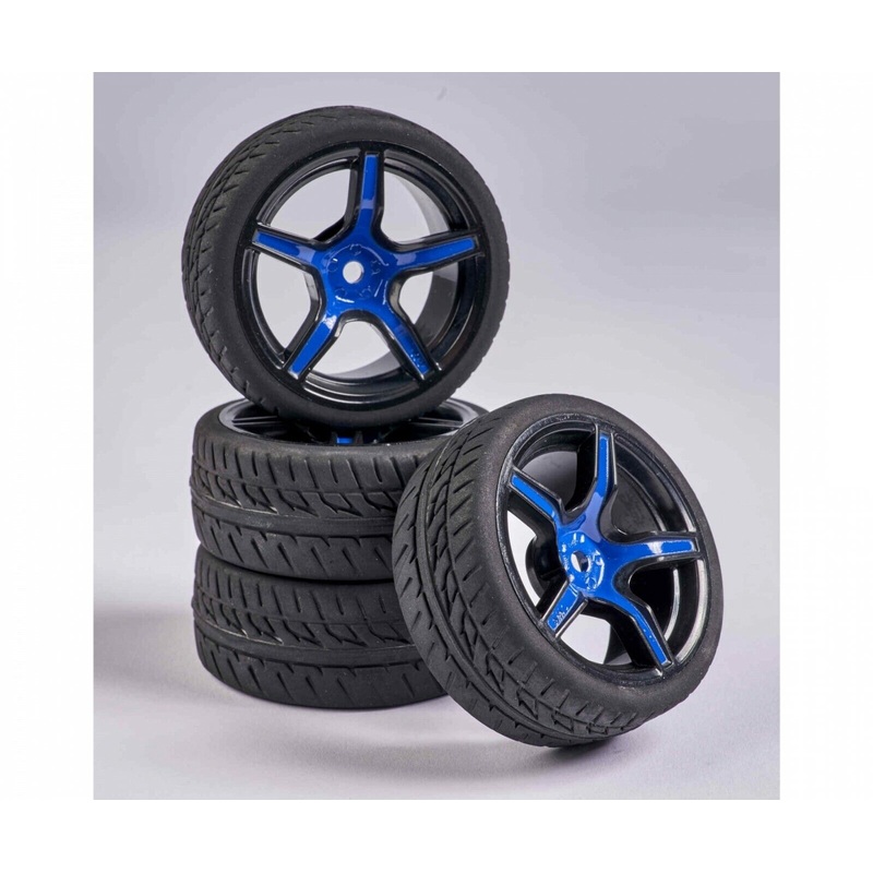 The fully bonded wheels are appropriate to on-road RC vehicles in a scale of 1:10 with 12 mm standard hex wheel hub. The special rubber compound of the tyres as well as the high-quality foam inserts and the handy road profile ensure excellent driving characteristics in almost all weather and road conditions. The blue and black rims with five spokes also give your on-road RC vehicle a distinctive look!