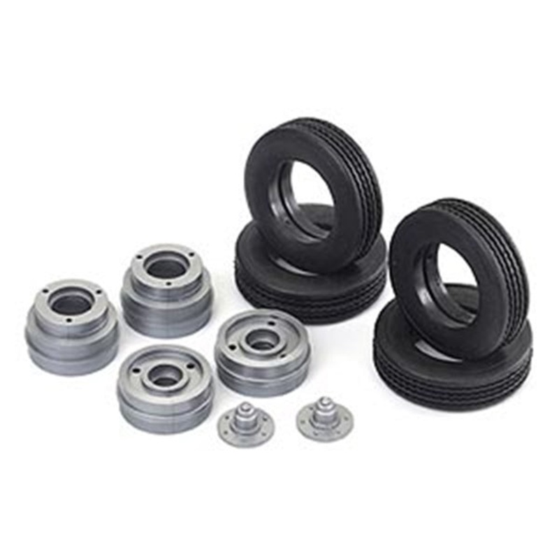 Set consisting of four flatbed truck tyres (outer 52 mm, inner 30 mm, width 14 mm) and two double wheel rims with hubcaps. The wheel rims are designed for retrofitting with ball bearings 11 x 5 x 4 (4 for each double rim).