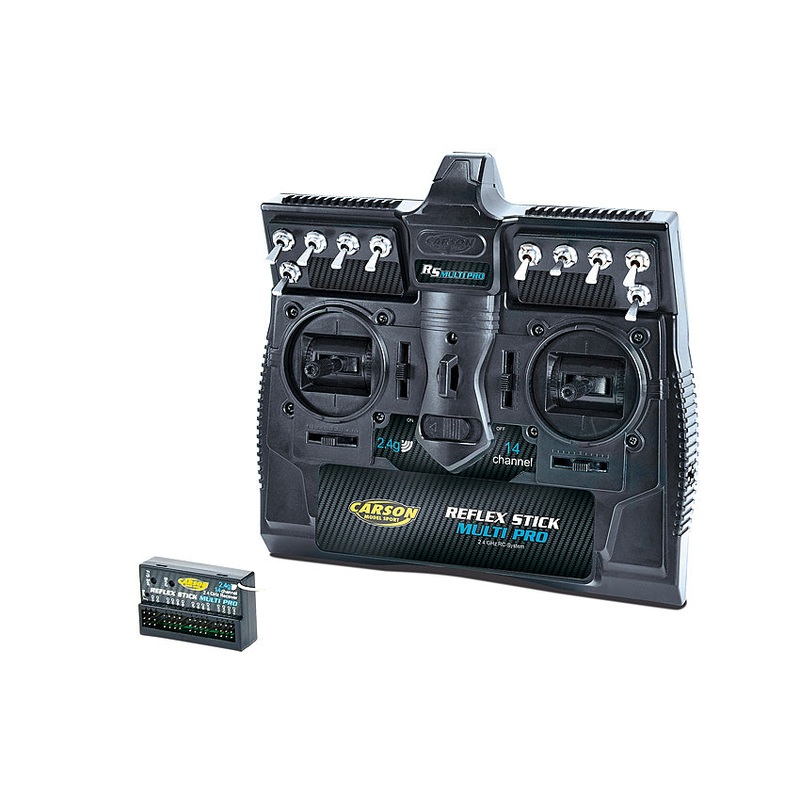 The Reflex Stick PRO MULTI 14 channel from Carson Model Sport is an inexpensive but fully equipped and technologically advanced 14-channel remote control system for universal use in many RC vehicles and ships. It can be control independently 14 channels vi
