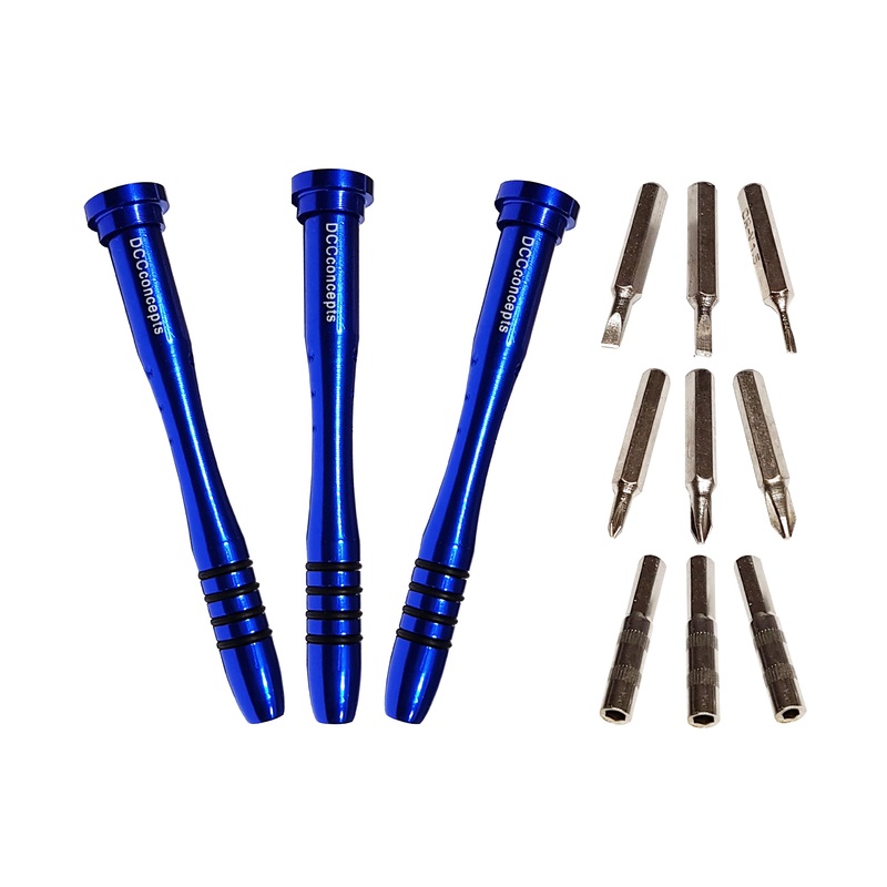 DCC Concepts DCT-SND.12 Screw and Nut Driver Set Screw and Nut Driver Set Three Handles, Three essential (-) type screwdriver tips, 3 essential (+) type screwdriver tips and 3 important Nut Drivers for use with model railways and similar hobbies. Have you