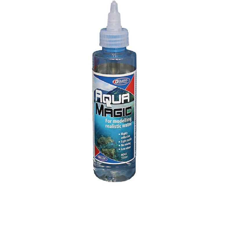 For modelling realistic water.No mixing, safe & low odour-light stable.Aqua Magicis a 1-part solution to the scale modelling of water effects such as rivers, canals, lakes, ponds, puddles & mud.It requires no mixing, is easy to pour and rapidly dries clear