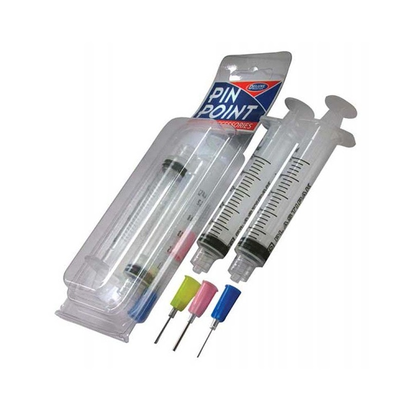 Pack of 2 dispensing syringes and 3 sizes of stainless steel needles for accurate application of water based glues: