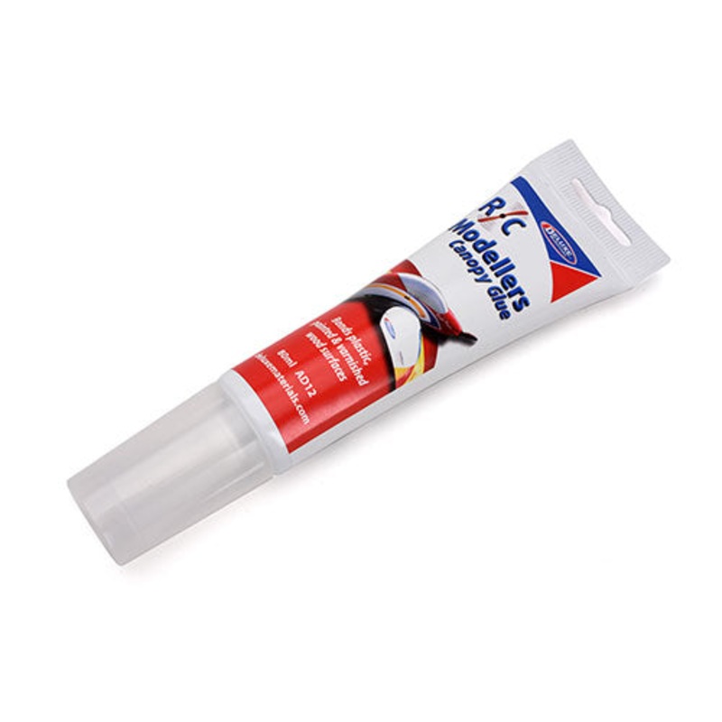 Deluxe Materials R/C Modellers Canopy Glue is a multi-purpose gap filling glue that is ideal for gluing canopies and other clear plastic parts. It is thick and tacky so it will not run into unwanted places and while it starts out white (so you can see where you have applied the glue), it then dries clear and remains flexible. It will bond a combination of wood, plastic, fabric, foil and even painted surfaces.