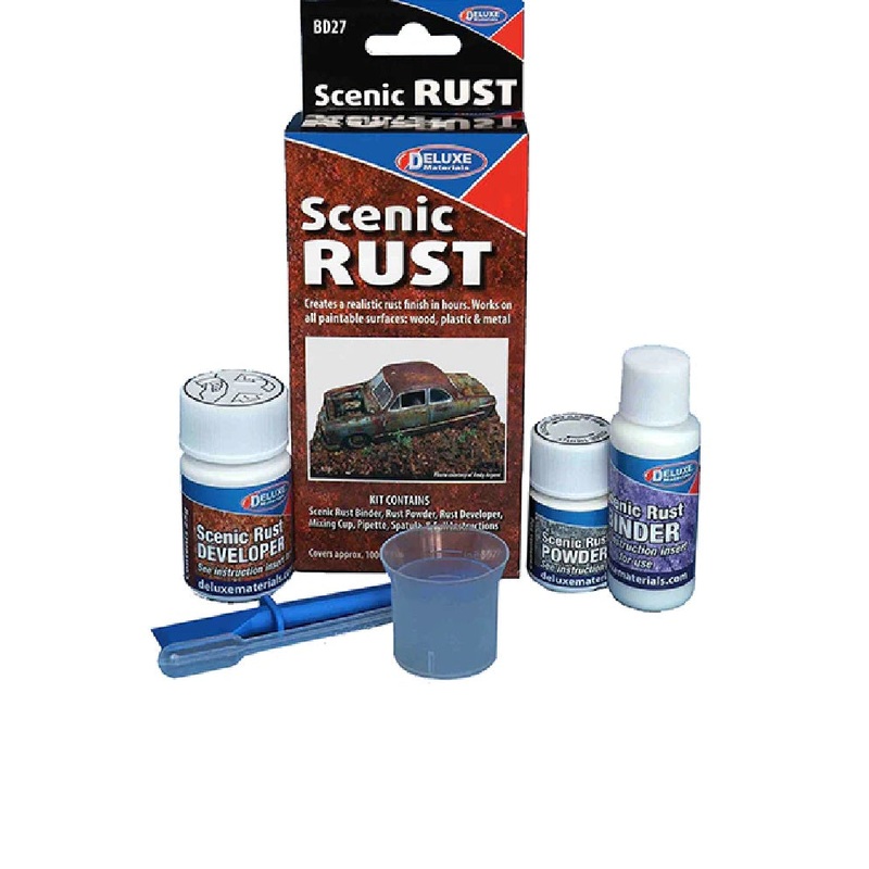 A three part system that puts a realistic scale like rust finish onto all types of paintable surfaces, wood, plastic, metal, within hours thereby creating greater realism for all types of modelling.PLEASE NOTE! CANNOT BE SENT OVERSEAS.CAN ONLY BE SENT UK M