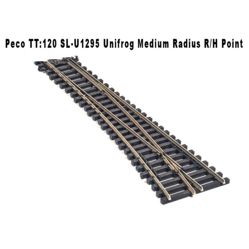 Peco TT:120 SL-U1295 Unifrog Medium Radius R/H Point Code 55 Unifrog Use SL-310 metal rail joiners and SL-1208 joining sleepers. One of the great advantages of TT:120 is that the 12mm gauge track correctly scales out as standard (4' 8.5") gauge, as used al
