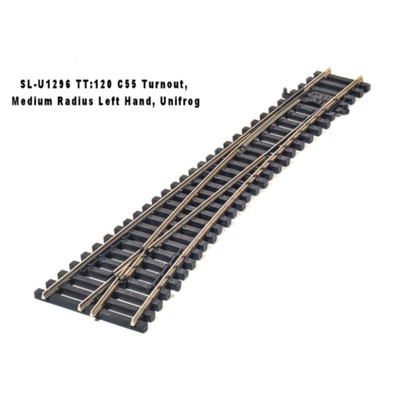 Peco TT:120 SL-U1296 Unifrog Medium Radius L/H Point PECO TT:120CODE 55 TT:120 C55 TURNOUT, MEDIUM RADIUS, LEFT HAND, UNIFROG Code 55 Unifrog Use SL-310 metal rail joiners and SL-1208 joining sleepers. One of the significant advantages of TT:120 is that th